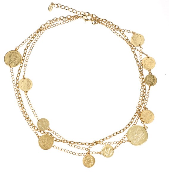 Niezwykle modny potrójny łańcuszek z monetami. Długość najdłuższego łańcuszka 53cm, szerokość 0,4cm, monety średnica 2,2cm. Łańcuszek pozłacany.
