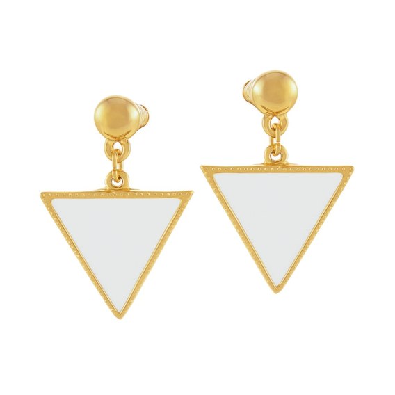 Eleganckie kolczyki o geometrycznym kształcie trójkąta, wypełnione gładką, białą emalią to subtelne połączenie połyskującego złota z minimalistyczną bielą. Doskonale pasują zarówno do codziennych stylizacji, jak i wieczorowych zestawów.