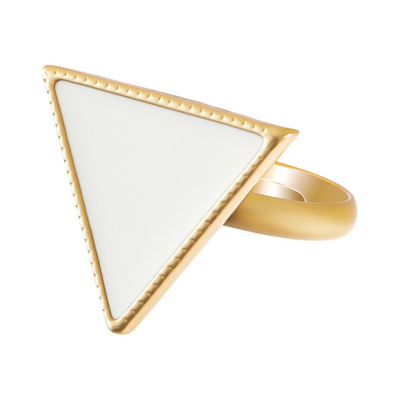 Stylowy pierścionek z trójkątnym motywem to połączenie nowoczesnego designu i klasycznej elegancji. Złota oprawa pięknie kontrastuje z ręcznie malowaną, białą emalią, tworząc wyjątkowy efekt subtelnego blasku. Dzięki regulowanemu rozmiarowi, pierścionek idealnie dopasowuje się do każdego palca, zapewniając wygodę noszenia i perfekcyjne dopasowanie. Wielkość ozdoby 2cm/2cm/2cm.