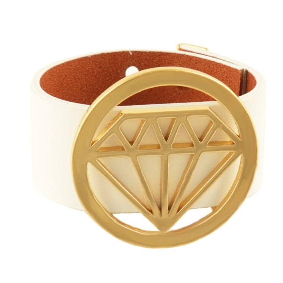 Pozłacana skórzana, biała bransoletka z diamentem. Długość bransoletki wynosi 18-19 cm/ szerokość 3,2 cm.
