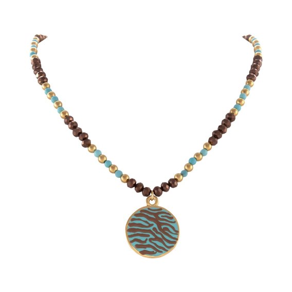 Naszyjnik z czekoladowych koralików, turkusów i złotych kuleczek z zawieszką w zeberkę (C25/LAT/155AU)