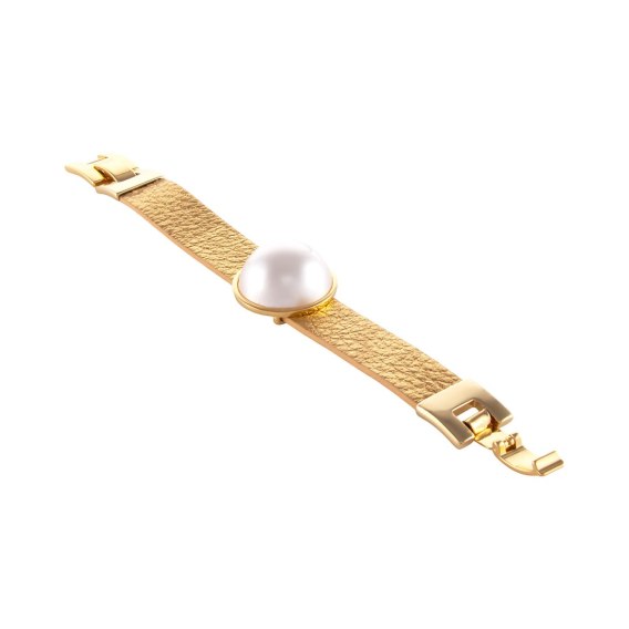 Elegancka bransoletka wykonana z miękkiej, naturalnej skóry w połączeniu z elementami w kolorze złota. Centralnym punktem ozdoby jest subtelna perła, która dodaje całości klasy i ponadczasowego uroku. Bransoletka doskonale sprawdzi się zarówno w codziennych stylizacjach, jak i podczas wyjątkowych okazji.